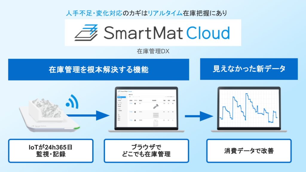 スマートマットクラウドは、通信機能を備えた体重計型のIoTデバイスを活用したサービスです。デバイスの上に物を載せるだけで重量データを取得し、在庫数を自動算出。そのデータをクラウドに送信し、在庫管理や最適化を支援します。